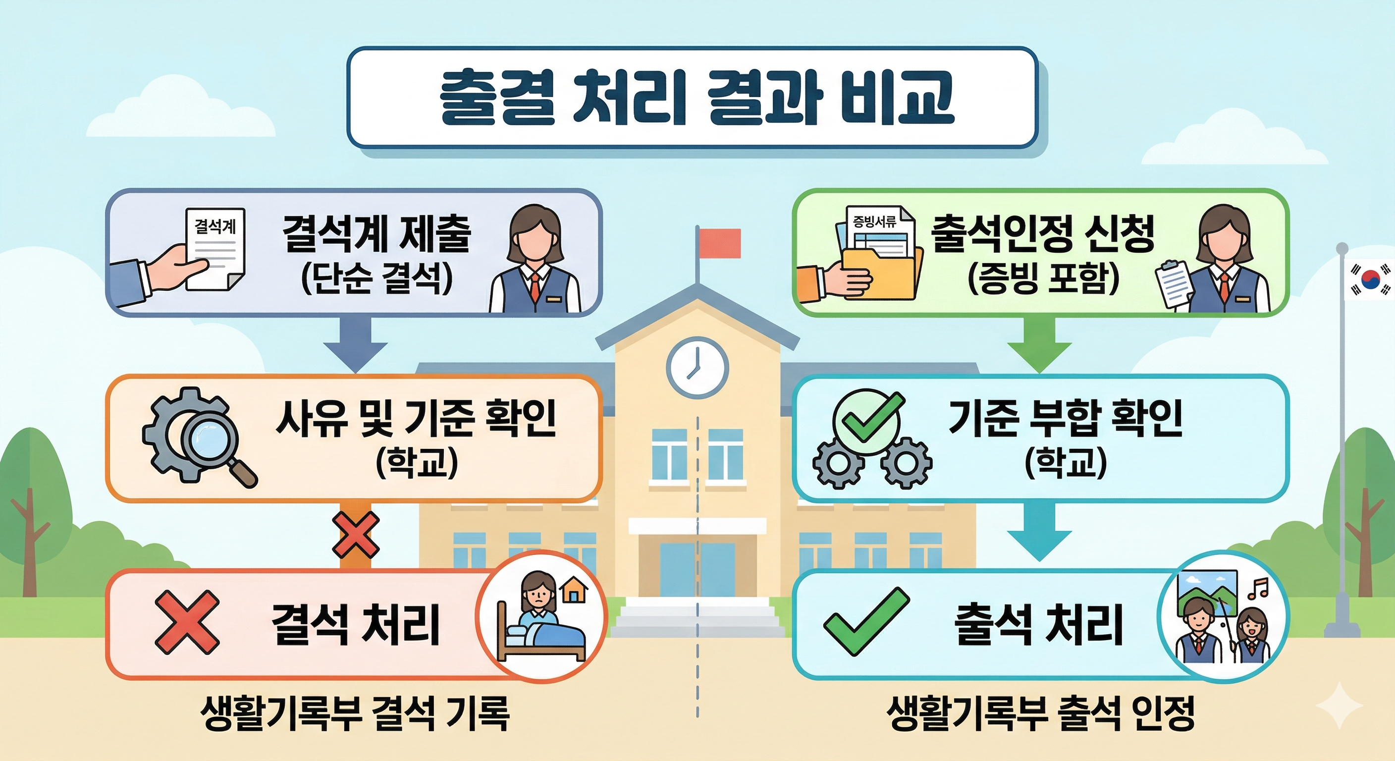 - 모든 결석이 출석인정이 되는 것은 아니며, 학교 기준과 사유가 중요합니다.